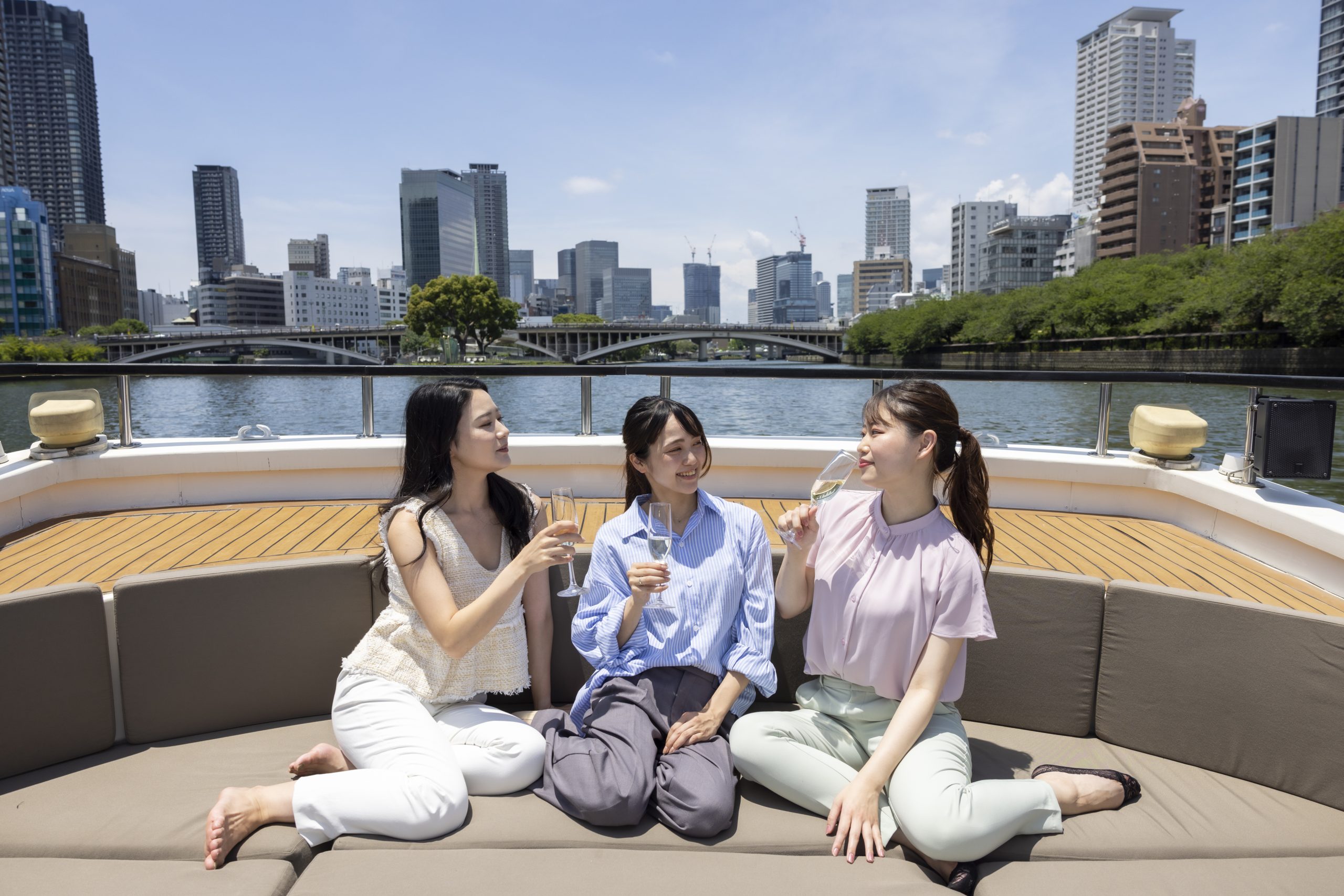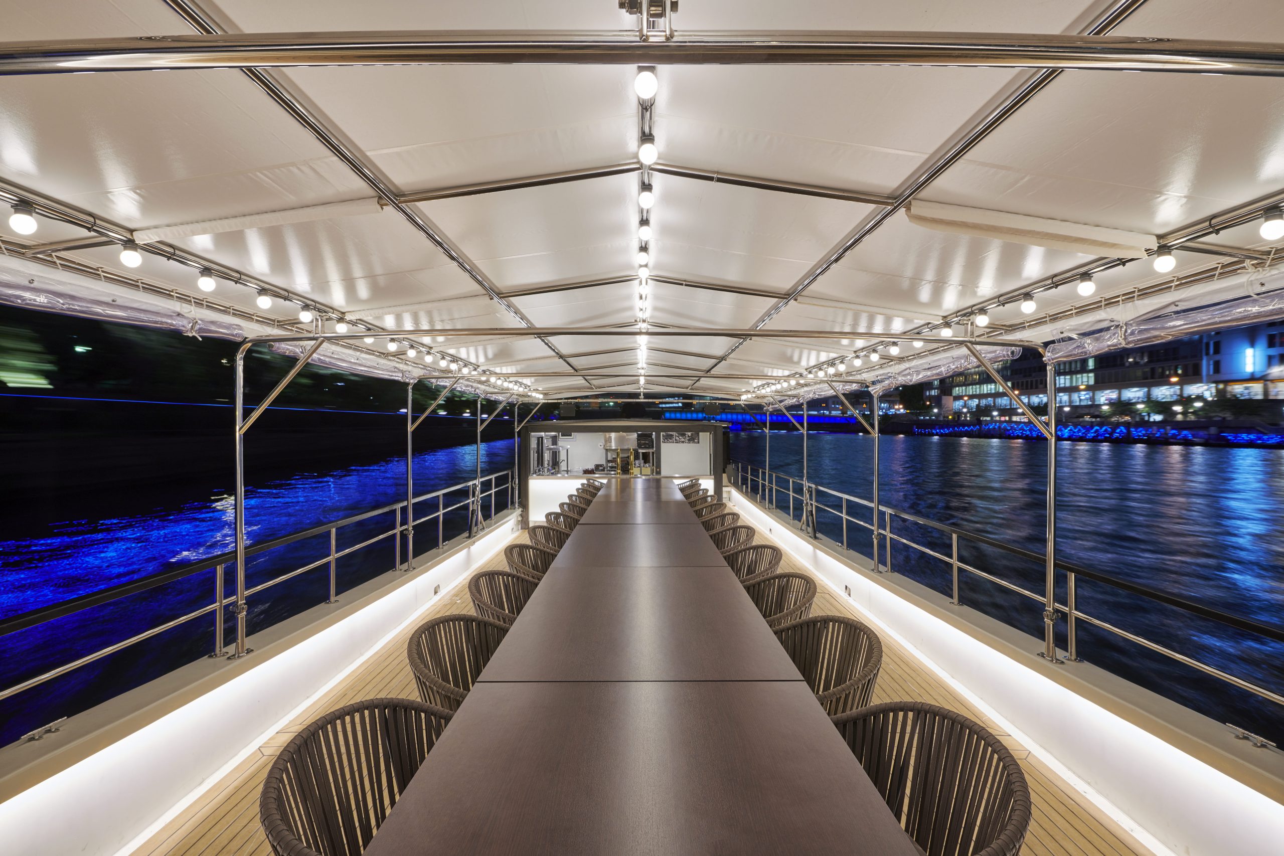 オープンエアーのクルーズ船。屋外ならではの心地よい風を感じながらのリバークルーズは、大都会にいながらラグジュアリーなリゾート気分を味わえる。