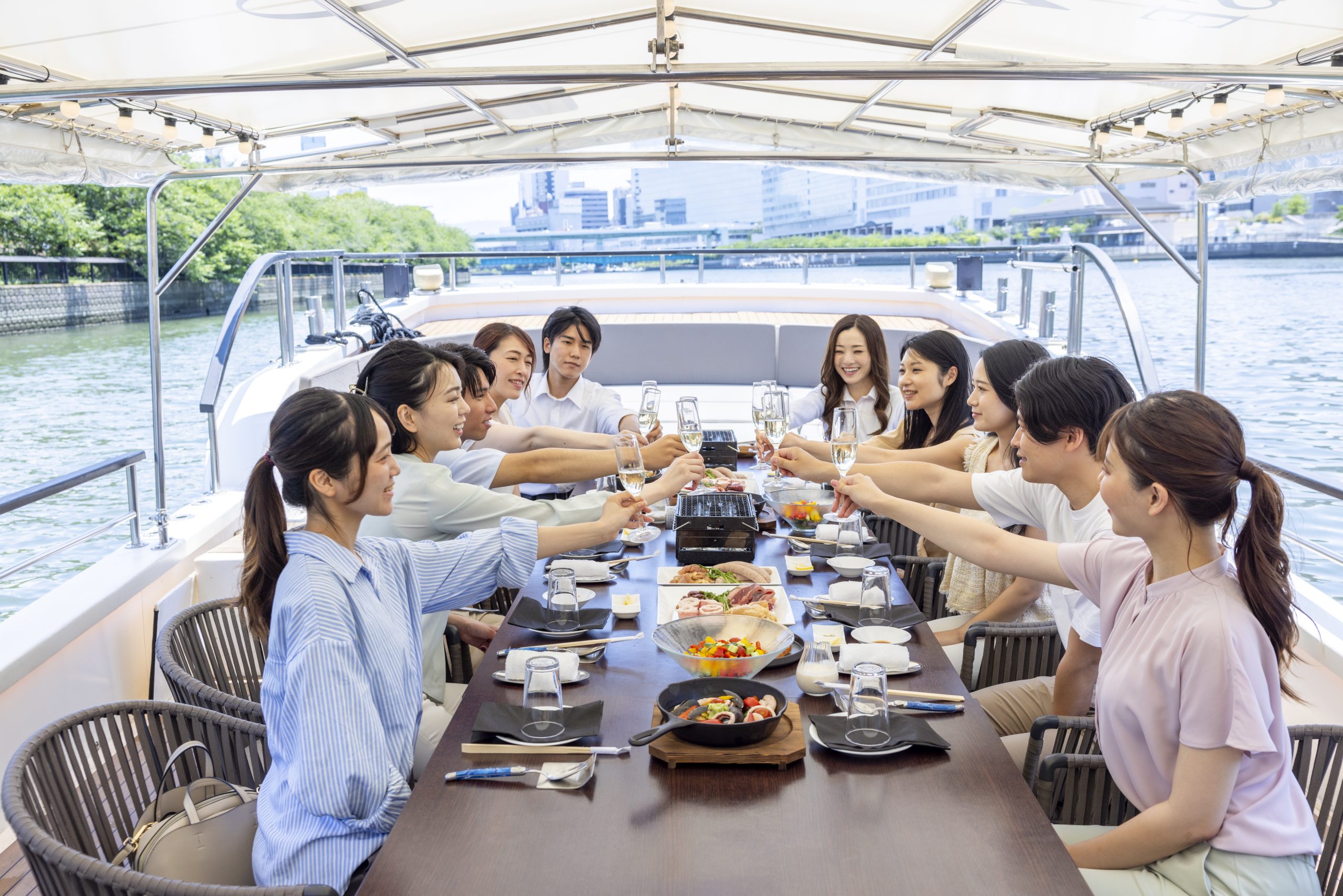 食事は大阪の風景を水上から一望できる抜群のロケーションの中、BBQを楽しめる。