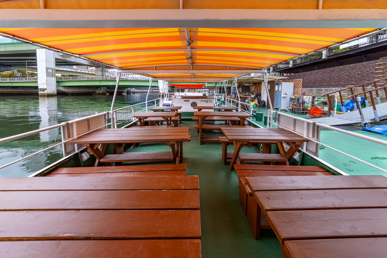 航路により簡易屋根の取り付けも可能で自由にレイアウトが出来、椅子、テーブルセットで40名、ベンチ仕様で44名まで乗船可能。
