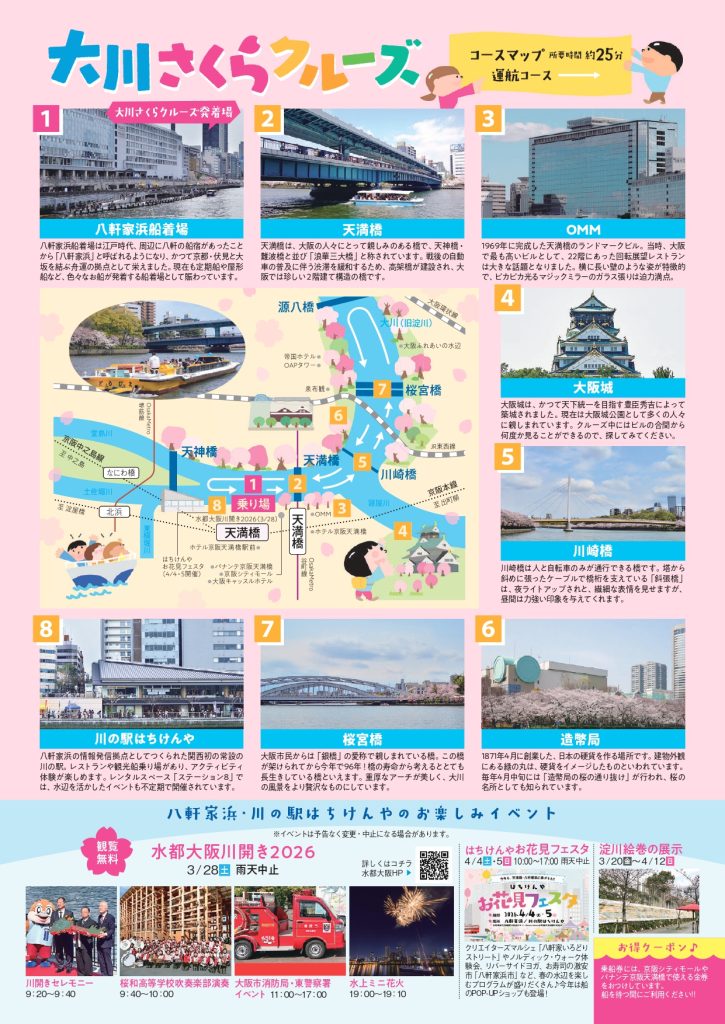 天満橋八軒家浜では、3月24日(火)より「大川さくらクルーズ」(主催:大阪シティクルーズ推進協議会)がスタートし、桜並木の続く大川を多くのお花見クルーズの船が行き交って賑わいを見せます。