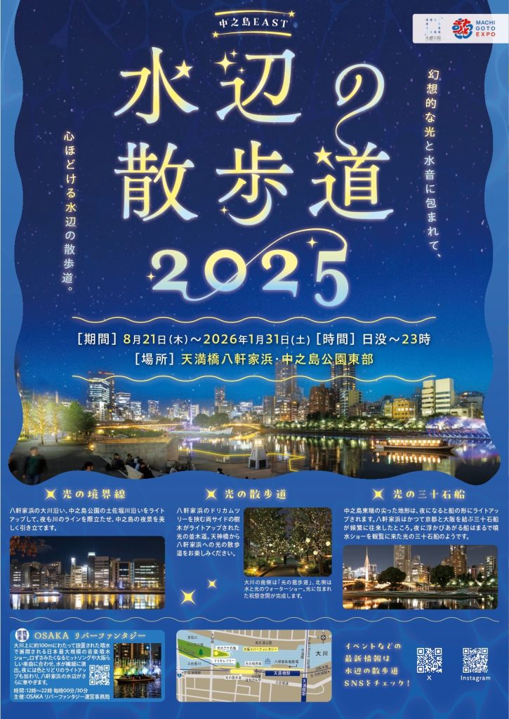 大川上に約100mにわたって設置された噴水で展開される日本最大規模の音楽噴水ショー。口ずさみたくなるヒットソングや大阪らしい楽曲に合わせ、水が繊細に演出。夜には色とりどりのライトアップも加わり、八軒家浜の水辺がさらに華やぎます。
